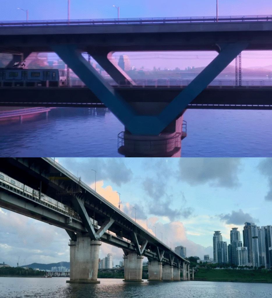 From certain areas of the park, Cheongdam Bridge comes into view — a massive structure with trains running below and cars above, creating a striking urban silhouette.