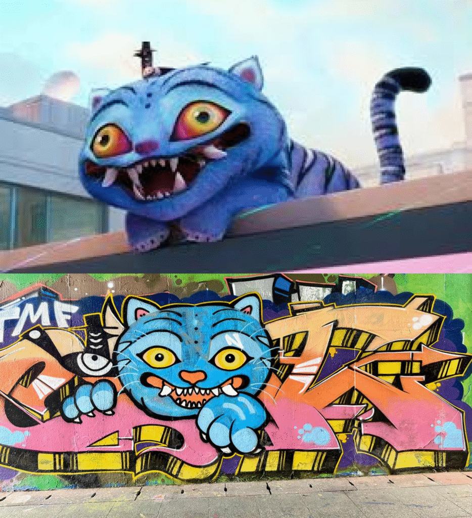 Near Apgujeong Rodeo, murals inspired by traditional Korean folk paintings line the underpass walls. Characters based on Horakdo (tiger and magpie paintings) reinterpret tradition through modern graffiti.